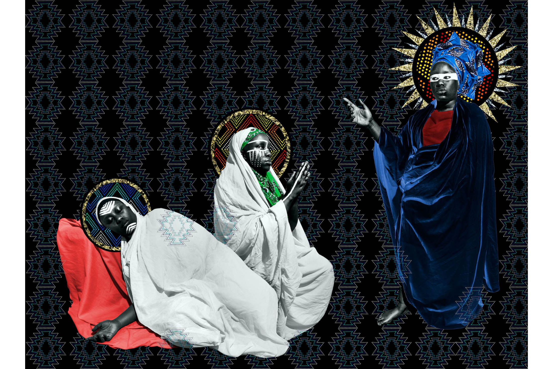 By transmuting pictures of herself using digital enhancements and manipulation, and often darkening her skin, she transforms her subjects into deified icons that transcend the horror of their personal stories. “Rather than relating to them through the violence, I want to relate to them through their glory,” she says. “I believe that every woman is glorious and our glory is infinite.”
